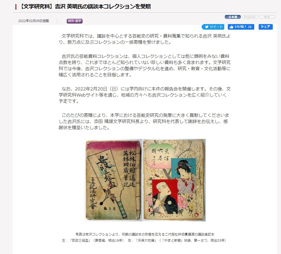 斯界随一の蒐集家であり研究者である吉沢氏のコレクションの一括受贈は、学界への影響も大きいため、2022年2月に広報課を通じて大学HPで受贈を公表した。